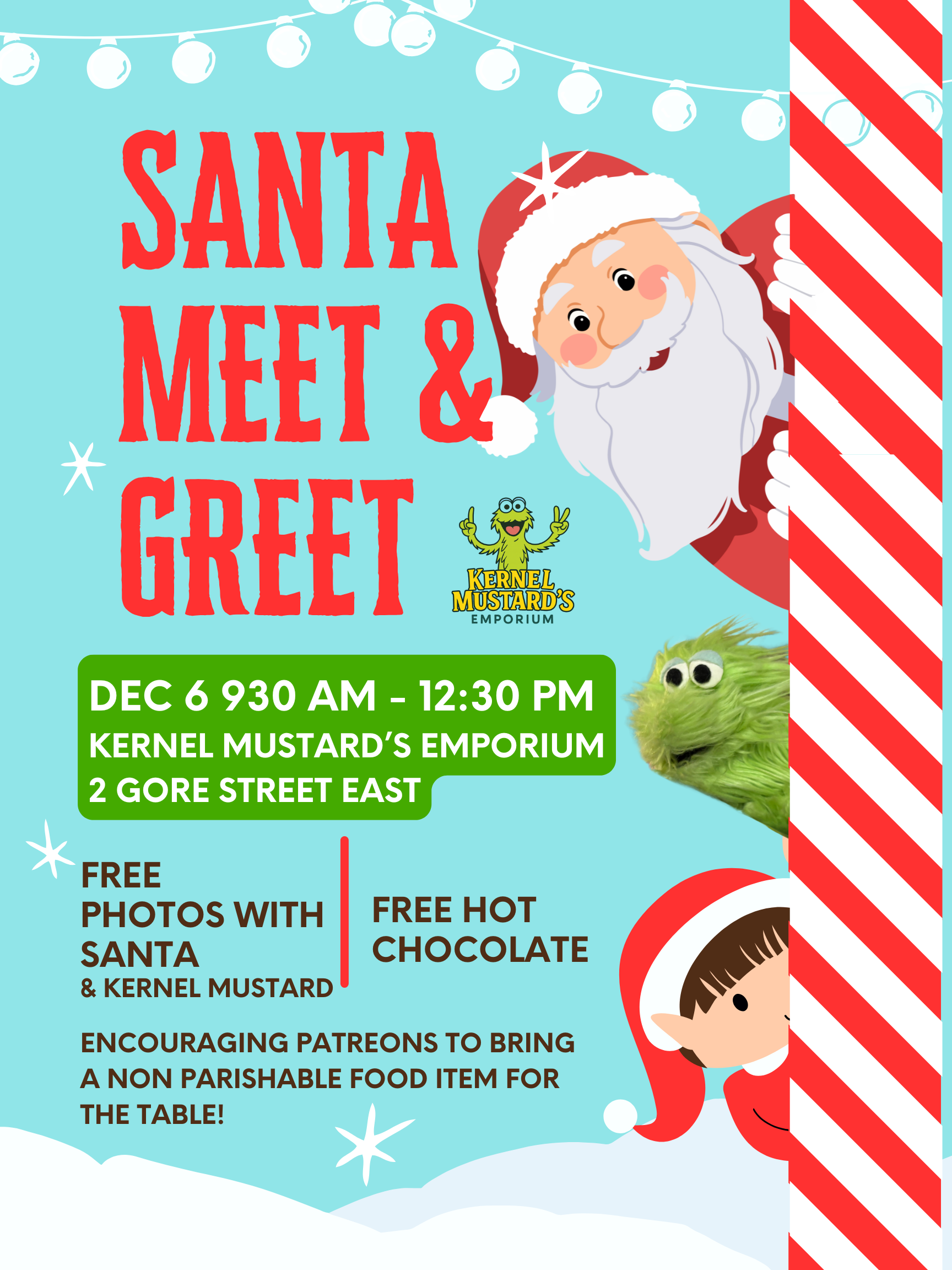 Santa Claus will be coming to visit Kernel Mustard's Emporium on Saturday, December 6, located at 2 Gore Street East! Stop by between at 9:30 a.m.-12:30 p.m. for free photos with Santa and free hot chocolate. Donations of non-perishable food items for The Table Community Food Centre are encouraged.